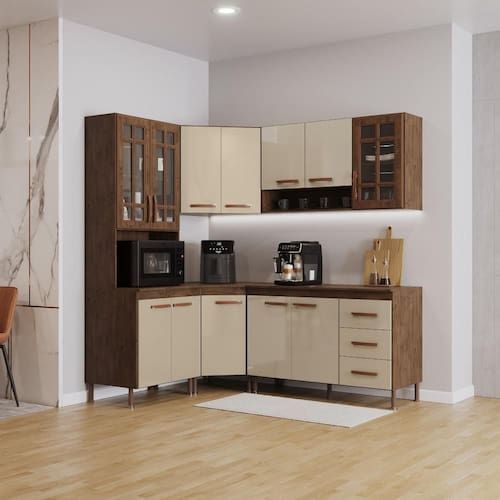 Com módulos avulsos, cada peça é independente, permitindo diferentes composições para melhor aproveitamento do espaço. Seu interior é bem distribuído, com prateleiras e divisórias que auxiliam na organização de utensílios e mantimentos.
