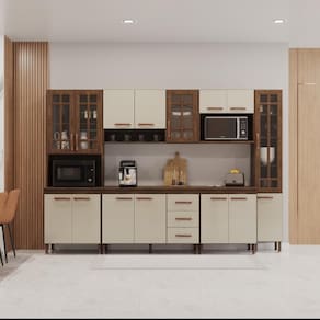 Com módulos avulsos, cada peça é independente, permitindo diferentes composições para melhor aproveitamento do espaço. Seu interior é bem distribuído, com prateleiras e divisórias que auxiliam na organização de utensílios e mantimentos.