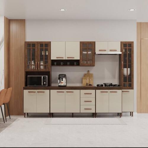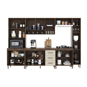 QUANTIDADE DE GAVETAS: 3 | LARGURA (CM): 295 | QUANTIDADE DE PORTAS: 15 | MATERIAL: MDP | ALTURA (CM): 204,5 | PROFUNDIDADE (CM): 53 | TAMPO DO BALCÃO INCLUSO: Sim | QUANTIDADE DE PEÇAS: 6 | Tipo de móveis de cozinha: Completa | Requer Montagem: Sim | Materiais do Corpo: MDP | Inclui manual de montagem: Sim | Cor: Noce/Off-White