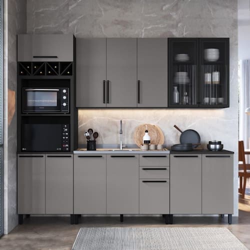 A Cozinha Modulada Mônaco da Fidelitá é a união ideal entre modernidade, funcionalidade e acabamento premium. Composta por 5 módulos, oferece 13 portas, 2 gavetas e diferenciais que valorizam o projeto da sua cozinha. Com a elegância do acabamento Titânio e portas com vidro fumê, essa versão é perfeita para quem deseja sofisticação e versatilidade.