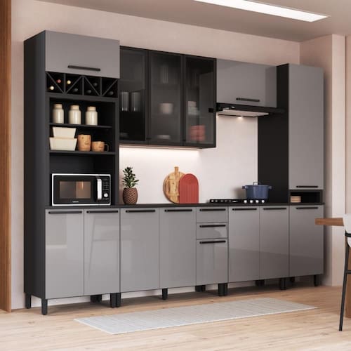 A Cozinha Modulada Mônaco da Fidelitá é ideal para quem busca um projeto elegante, prático e completo para o dia a dia. Composta por 6 módulos independentes, esta versão oferece 14 portas, 2 gavetas, torre quente com adega, paneleiro funcional e dois balcões com tampo. Com acabamentos de alto padrão e excelente aproveitamento de espaço, é perfeita para transformar sua cozinha.