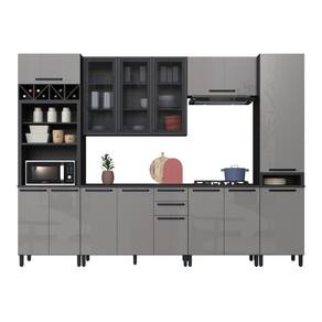 Produzida em MDP de alta qualidade, conta com pintura UV perolizada na cor Titânio e acabamento sofisticado. Entre seus diferenciais estão: dobradiças metálicas com slow motion, puxadores em metal, portas com vidro fumê, corrediças telescópicas, prateleiras removíveis, tampo de 22mm e pés com regulagem, que se adaptam à altura do ambiente.