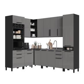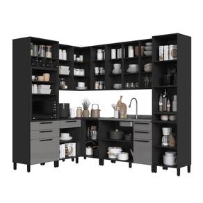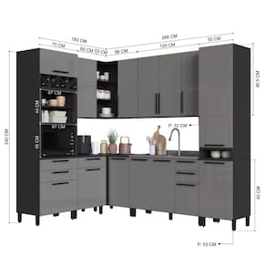 Fabricada em MDP de alta qualidade, esta versão conta com pintura UV perolizada na cor Titânio, prateleiras removíveis, dobradiças metálicas com slow motion, puxadores em metal, corrediças telescópicas nas gavetas, pés com regulagem de altura (+3cm) e tampos inclusos em dois módulos inferiores.
