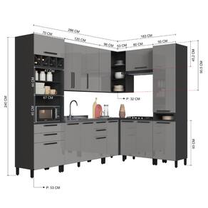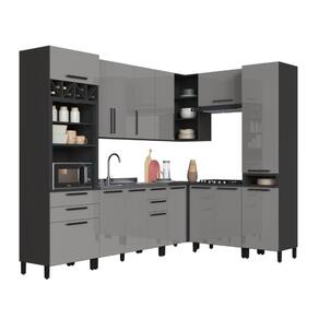 Fabricada em MDP de alta qualidade, essa versão conta com acabamento UV perolizado na cor Titânio, dobradiças metálicas slow motion, corrediças telescópicas, puxadores em metal, prateleiras removíveis, tampo maciço de 22mm (em módulos específicos) e pés com regulagem de altura (+3cm).