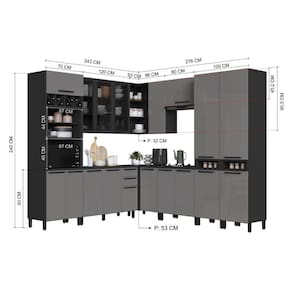 MATERIAL: MDP | Tipo de móveis de cozinha: Cozinha Completa | TAMPO DO BALCÃO INCLUSO: SIM | QUANTIDADE DE GAVETAS: 2 | QUANTIDADE DE PORTAS: 18 | PROFUNDIDADE (CM): 53 | ALTURA (CM): 240 | QUANTIDADE DE PEÇAS: 8 | LARGURA (CM): 519 | Inclui tampo: Sim | Materiais do corpo: MDP | Inclui manual de montagem: Sim | Cor: Chumbo/Titânio