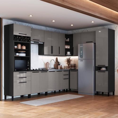 MATERIAL: MDP | Tipo de móveis de cozinha: Cozinha Completa | TAMPO DO BALCÃO INCLUSO: NÃO | QUANTIDADE DE GAVETAS: 4 | QUANTIDADE DE PORTAS: 16 | PROFUNDIDADE (CM): 53 | ALTURA (CM): 240 | QUANTIDADE DE PEÇAS: 9 | LARGURA (CM): 549 | Inclui tampo: Não | Materiais do corpo: MDP | Inclui manual de montagem: Sim | Cor: Chumbo/Titânio