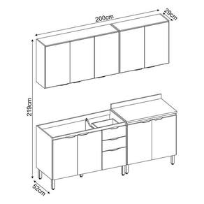 A Cozinha Modulada Firenze Composição 8 é formada por um aéreo de 120cm com 3 portas, um aéreo de 80cm com duas portas, um balcão de 80cm que pode ser como suporte para coocktop, um balcão 120cm com 3 portas e 2 gavetas com corrediças telescópicas e suporta pia de 120cm. Seus pés são de polipropileno reguláveis se adequando as condições do chão, puxadores pretos com design moderno, corrediças telescópicas e dobradiças metálicas. Estruturado em MDP com revestimento ultravioleta e acabamento fosco.
