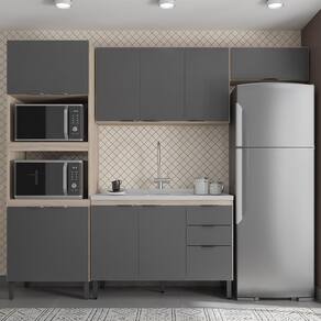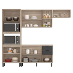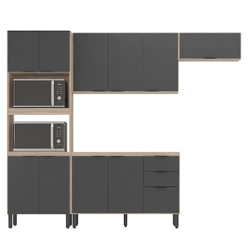 A Cozinha Modulada Firenze Composição FMT04 é composta por paneleiro com espaços para instalar forno micro-ondas e forno elétrico, armários aéreos com prateleiras internas de diferentes dimensões e também um balcão de 120cm com 3 portas e 2 gavetas que suporta pia de 120cm. Seus pés são de polipropileno reguláveis se adequando as condições do chão, puxadores pretos com design moderno, corrediças telescópicas e dobradiças metálicas. Estruturado em MDP com revestimento ultravioleta e acabamento fosco.