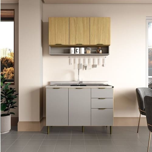 Com um visual moderno, a Cozinha Modulada Ibiza Casamia é composta por 2 módulos: 01 balcão de pia de 120cm sem tampo e 01 aéreo com nicho de 120cm.