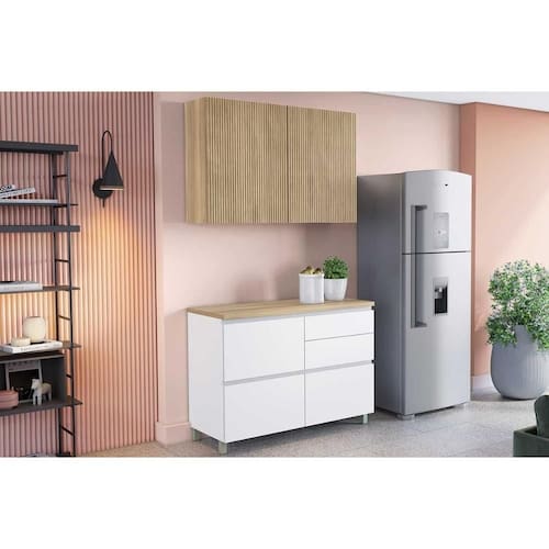 Balcão de Cozinha p/ Pia c/ Tampo Rainha c/ 1 Porta Basculante e 4 Gaveta 120 cm Branca/Nature - Nesher