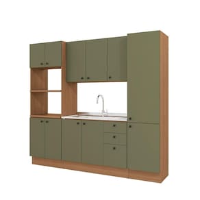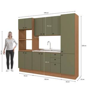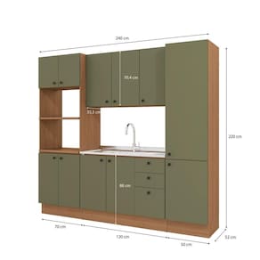 Acabamento: 100% BP / Pintura Touch | Cor: CANELA/VERDE FREVO | Corrediças: Telescópicas | Dobradiça: Com Amortecimento | Garantia: 3 meses para defeito de fabricação | Matéria-prima: MDP / MDP BP | Peso suportado por cada gaveta: 6 Kg | Peso suportado por cada prateleira: 7 kg | Puxadores: Metálicos | Quantidade de gavetas: 3 | Quantidade de portas: 2 / 3 / 4 | Quantidade de prateleiras: 1 / 2 / 4 / 6 | Sistema de montagem: Parafuso Philips / Parafuso Philips e Minifix | Tipo de porta: Bater | Requer montagem: Sim | Tipo de móveis de cozinha: Cozinha completa | Inclui manual de montagem: Sim