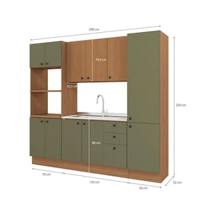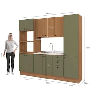Acabamento: 100% BP / Pintura Touch | Cor: Canela/Verde Frevo/Canela | Corrediças: Telescópicas | Dobradiça: Com Amortecimento | Garantia: 3 meses para defeito de fabricação | Matéria-prima: MDP / MDP BP | Peso suportado por cada gaveta: 6 Kg | Peso suportado por cada prateleira: 7 kg | Puxadores: Metálicos | Quantidade de gavetas: 3 | Quantidade de portas: 2 / 3 / 4 | Quantidade de prateleiras: 1 / 2 / 4 / 6 | Sistema de montagem: Parafuso Philips / Parafuso Philips e Minifix | Tipo de porta: Bater | Requer montagem: Sim | Tipo de móveis de cozinha: Cozinha completa | Inclui manual de montagem: Sim