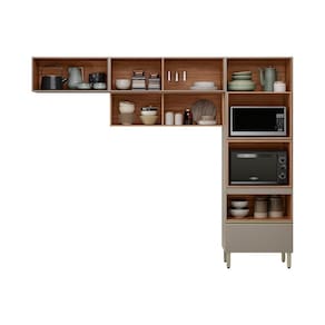 ESPECIFICAÇÕES: Estrutura em MDF Pintura UV Portas Dobradiças com amortecimento Pistão a gás Gavetas Corrediças telescópicas Puxadores metálicos Espaço para forno e micro-ondas (L x A x P): 64 x 45 x 51 cm Pés com regulagem de altura Amplo espaço interno