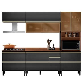 Cozinha Modulada Proença 5 Peças Com Aéreo 80cm Nogueira Touch/carbono Prime Tx - Demartêz Cozinha Modulada Proença 5 Peças com Aéreo 80cm - Demartêz A Cozinha Modulada Proença 5 Peças com Aéreo 80cm une sofisticação e praticidade. Fabricada em MDF com pintura UV, conta com portas, sendo 3 com vidro reflecta, dobradiças com amortecimento e pistão a gás. Possui gavetas com corrediças telescópicas para abertura suave, puxadores metálicos e espaço planejado para cooktop, depurador e forno ou micro-ondas (64 x 45 x 51 cm). O balcão de 120cm acompanha divisor de talheres, e os tampos em MDF estão presentes nos balcões de 120cm e 80cm. Com pés reguláveis e amplo espaço interno, é ideal para uma cozinha organizada e elegante. ESPECIFICAÇÕES: - Estrutura em MDF - Pintura UV - Portas sendo 3 com vidro reflecta - Dobradiças com amortecimento - Pistão a gás - Gavetas - Corrediças telescópicas - Puxadores metálicos - Espaço para cooktop e depurador - Espaço para forno ou micro-ondas (L x A x P): 64 x 45 x 51 cm - Acompanha divisor de talheres no balcão 120cm - Tampo em MDF no balcão 120cm e 80cm - Pés com regulagem de altura - Amplo espaço interno