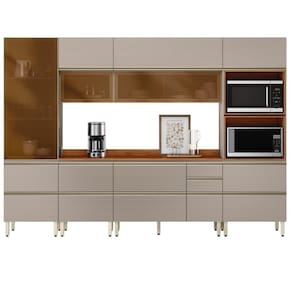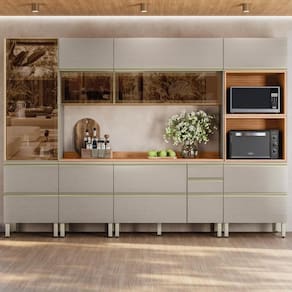 A Cozinha Modulada Proença 6 Peças com Cristaleira e Aéreo 120cm combina funcionalidade e design refinado. Produzida em MDF com pintura UV, conta com portas sendo 3 com vidro reflecta, dobradiças com amortecimento e pistão a gás. Suas gavetas possuem corrediças telescópicas para abertura suave, e os puxadores metálicos agregam durabilidade e elegância. O módulo torre quente oferece espaço para forno e micro-ondas (64 x 45 x 51 cm), enquanto o balcão de 120cm acompanha divisor de talheres. Os tampos em MDF estão presentes nos balcões de 120cm e 60cm. Com pés reguláveis e amplo espaço interno, é ideal para quem busca uma cozinha completa e sofisticada.