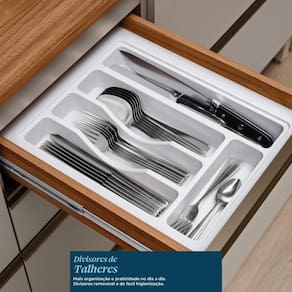 ESPECIFICAÇÕES: Estrutura em MDF Pintura UV Portas sendo 1 com vidro reflecta e 2 ripadas Dobradiças com amortecimento Pistão a gás Gavetas Corrediças telescópicas Puxadores metálicos Espaço para forno e micro-ondas (L x A x P): 64 x 45 x 51 cm Acompanha divisor de talheres no balcão 120cm Tampo em MDF nos balcões 120cm e 60cm Pés com regulagem de altura Amplo espaço interno