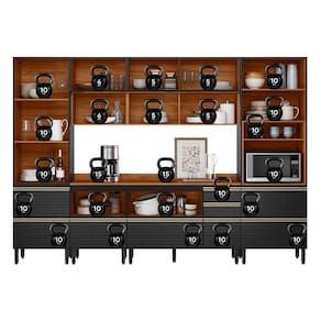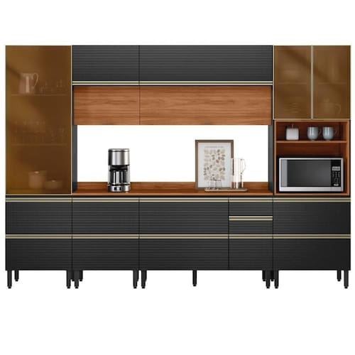 A Cozinha Modulada Proença 6 Peças com Paneleiro 1 Forno combina funcionalidade e design refinado. Produzida em MDF com pintura UV, conta com portas sendo 3 com vidro reflecta, dobradiças com amortecimento e pistão a gás. Suas gavetas possuem corrediças telescópicas para abertura suave, e os puxadores metálicos agregam durabilidade e elegância. O módulo paneleiro oferece espaço para forno ou micro-ondas (64 x 45 x 51 cm), enquanto o balcão de 120cm acompanha divisor de talheres. Os tampos em MDF estão presentes nos balcões de 120cm e 60cm. Com pés reguláveis e amplo espaço interno, é ideal para quem busca uma cozinha completa e sofisticada.