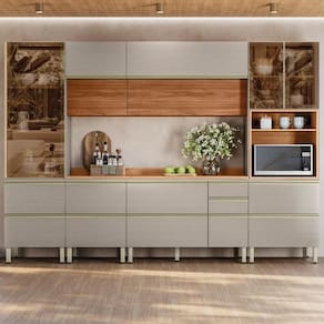 A Cozinha Modulada Proença 6 Peças com Paneleiro 1 Forno combina funcionalidade e design refinado. Produzida em MDF com pintura UV, conta com portas sendo 3 com vidro reflecta, dobradiças com amortecimento e pistão a gás. Suas gavetas possuem corrediças telescópicas para abertura suave, e os puxadores metálicos agregam durabilidade e elegância. O módulo paneleiro oferece espaço para forno ou micro-ondas (64 x 45 x 51 cm), enquanto o balcão de 120cm acompanha divisor de talheres. Os tampos em MDF estão presentes nos balcões de 120cm e 60cm. Com pés reguláveis e amplo espaço interno, é ideal para quem busca uma cozinha completa e sofisticada.