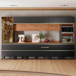 A Cozinha Modulada Proença 8 Peças com Cristaleira une sofisticação, resistência e praticidade em cada detalhe. Produzida em MDF com pintura UV, conta com portas, sendo uma com vidro reflecta, dobradiças com amortecimento, pistão a gás e puxadores metálicos que garantem durabilidade e suavidade no uso. Possui gavetas com corrediças telescópicas, divisor de talheres no balcão de 120cm, tampos em MDF nos balcões de 120cm e 60cm, além de espaço ideal para forno e micro-ondas. Com pés reguláveis e amplo espaço interno, é perfeita para deixar sua cozinha bem organizada e elegante.
