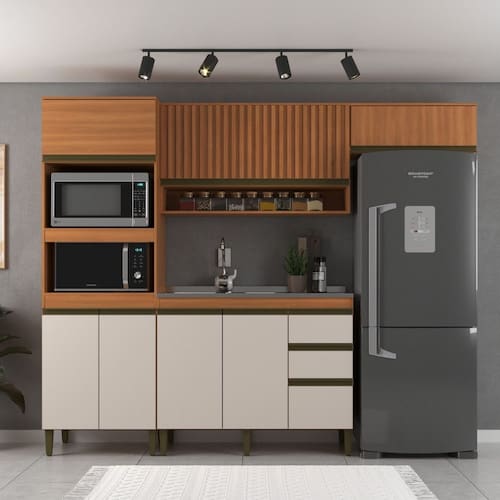 A Cozinha Modulada Ripada 4 Pecas Cecilia J Carvalho combina organizacao e design moderno para o ambiente. Com estrutura em MDP Perfect de 15 mm, oferece 7 portas com dobradicas metalicas, 3 gavetas com corredicas telescopicas e 2 nichos para forno ou micro-ondas. Possui prateleiras internas que ampliam o espaco de armazenamento, puxador perfil e pes de 17 cm em polipropileno. Nao acompanha pia e conta com sistema de montagem por parafusos philips.