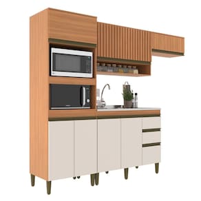 Caracteristicas: 3 Gavetas com corredicas telescopicas 2 Nichos para forno ou micro-ondas 7 Portas com dobradicas metalicas 2 Prateleiras internas Altura dos pes 17cm Espessura Chapa 15mm Estrutura em MDP Perfect Nao acompanha pia Pes em polipropileno Puxador perfil Sistema de montagem parafusos philips