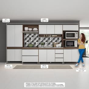 Cozinha Modulada Sabrina 360x202cm 6 Peças Menu Móveis Branco A Cozinha Sabrina Modulada foi desenvolvida para atender todas as suas necessidades do dia a dia com um design moderno, funcionalidade e versatilidade. A Cozinha Modulada e a tendencia do momento e foi arquitetada com modulos uteis que vao facilitar a sua rotina diaria, preparos dos alimentos e armazenamento dos utensilios e mantimentos, mantendo sua cozinha sempre organizada. Por se tratar de armarios de cozinha modulados voce pode ajustar os modulos conforme o espaco disponivel e montar diversas modulacoes diferentes para deixar o ambiente muito mais aconchegante. A elegancia fica por conta dos puxadores em perfil e os pes na cor prata dando um toque unico de sofisticacao. A Cozinha Sabrina e produzida com materiais de excelente qualidade, garantindo a durabilidade e vida util. O melhor em moveis no design atual aliando conforto, qualidade e otimos precos, so na Menu Moveis! Caracteristicas: Produzida em MDP de 15 mm Acabamento UV na cor Branco e Avela Portas com Dobradica Metalica Porta Basculante com Pistao a Gas Gavetas com Corredica Telescopica Puxadores Perfil em ABS na cor Prata Pes com Regulagem em ABS na cor Prata Balcao para Cooktop possui Tampo com Ranhura que pode ser utilizado com cooktop de 5 bocas, caso nao cortar pode utilizar normalmente. NAO acompanha TAMPO e PIA
