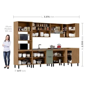 Medida de cada item (A x L x P): Torre 2 fornos 230x80x51,6cm; Aereo 1200 74x120x29cm; Balcao Pia 89,5x120x51,6cm; Aereo 37x80x29cm; Balcao 91,7x80x51,6cm; Aereo canto 74x97,7x57,6cm; Balcao Canto 91,7x97,7x57,6cm