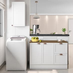 Cozinha Modulada Unna 2 Peças Aéreo 41cm e Balcão 120cm com Tampo MDP - Poliman Móveis A Cozinha Modulada Unna combina praticidade e design clássico para deixar seu ambiente ainda mais funcional e elegante. Produzida em MDP Perffect Touch com pintura UV, conta com 3 portas almofadadas/molduradas em MDF, 2 gavetas com corrediças telescópicas, prateleira interna e puxadores retrô em polímero que dão um charme especial. O balcão de 120cm já acompanha tampo em MDP de 27mm, garantindo resistência e durabilidade. Possui ainda pés em PVC reguláveis ao piso de 14,5cm e rodapés removíveis com presilhas modelo click, além de oferecer amplo espaço interno para organização.