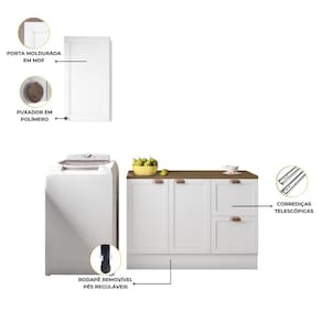 ESPECIFICAÇÕES: Estrutura em MDP Perffect Touch Pintura UV 3 Portas Dobradiças metálicas 2 Gavetas Corrediças telescópicas Prateleira interna Puxadores retrô em polímero Portas almofadadas/molduradas em MDF Pés em PVC reguláveis ao piso de 14,5 cm Rodapés removíveis com presilhas modelo click Balcão 120cm acompanha tampo MDP 27mm de espessura Amplo espaço interno