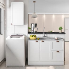Cozinha Modulada Unna 2 Peças Aéreo 41cm e Balcão 120cm sem Tampo - Poliman Móveis A Cozinha Modulada Unna é perfeita para quem busca estilo clássico aliado à praticidade no dia a dia. Produzida em MDP Perffect Touch com pintura UV, traz acabamento sofisticado e resistente. O conjunto é composto por aéreo de 41cm e balcão de 120cm sem tampo, pia ou cuba. Conta com 3 portas almofadadas/molduradas em MDF, 2 gavetas com corrediças telescópicas, prateleira interna e puxadores retrô em polímero que dão um toque de charme ao ambiente. Os pés em PVC reguláveis ao piso de 14,5 cm e os rodapés removíveis com presilhas modelo click garantem praticidade, enquanto o amplo espaço interno facilita a organização da cozinha.