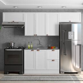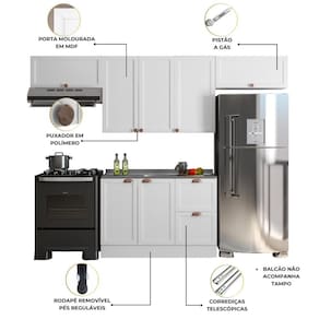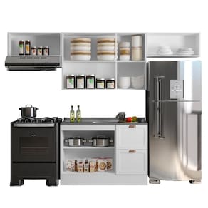 O ambiente é composto por (L x A x P): 2x Armário Aéreo Geladeira 80cm: 80 x 34 x 31 cm 1x Armário Aéreo 3 Portas 120cm: 120 x 76 x 31 cm 1x Balcão 2 Portas e 2 Gavetas 120cm sem Tampo: 120 x 84 x 50 cm (Não acompanha tampo em MDP e pia/cuba)