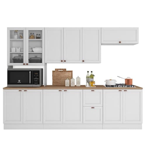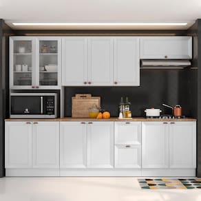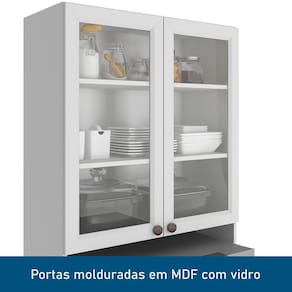 ESPECIFICAÇÕES: Estrutura em MDP Perffect Touch Pintura UV 12 Portas sendo 1 basculante e 2 molduradas com vidro transparente Dobradiças metálicas 2 Gavetas Corrediças telescópicas Prateleira interna Puxadores retrô em polímero Portas almofadadas/molduradas em MDF Pés em PVC reguláveis ao piso de 14,5 cm Rodapés removíveis com presilhas modelo click Balcões 120cm e 80cm acompanham tampo MDP 27mm de espessura Amplo espaço interno