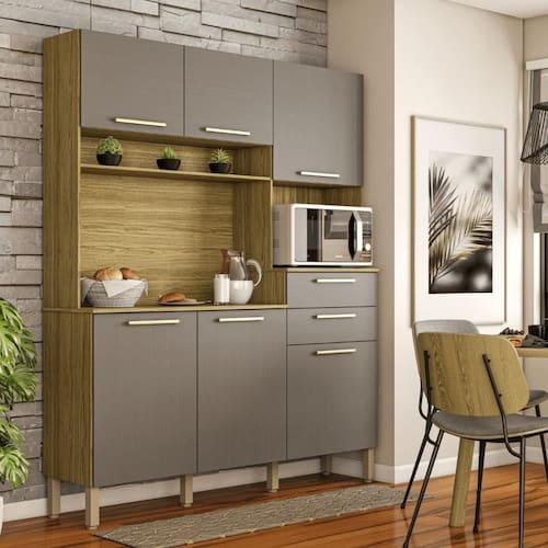 A Cozinha é produzida com madeira reconstituída - MDP de 12 mm e MDP de 15 mm nos tampos, provindo de reservas florestais para este fim, respeitando o meio ambiente. Possui seis portas, duas amplas gavetas - nas portas e gavetas são utilizados dobradiças e corrediças 100% metálicas. Os puxadores são em plástico resistente (poliestireno) com acabamento metalizado, que proporciona grande durabilidade. Seis pés reguláveis em plástico resistente (polipropileno) garantem a estabilidade do produto, podendo-se fazer pequenes ajustes na montagem, para o produto se adequar mesmo em pisos com pequenas irregularidades. Conta com nicho para pequenos objetos, além disso, tem nicho para micro-ondas e passa-fio no traseiro facilitando o acesso à tomada na parede. O espaço interno é bem dividido com a utilização de prateleiras, para melhor organizar os utensílios da cozinha. O acabamento é com pintura UV, deixando o móvel mais bonito com padrões de cor que trazem modernidade e beleza a sua cozinha.