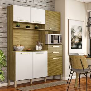 A Cozinha é produzida com madeira reconstituída - MDP de 12 mm e MDP de 15 mm nos tampos, provindo de reservas florestais para este fim, respeitando o meio ambiente. Possui seis portas, duas amplas gavetas - nas portas e gavetas são utilizados dobradiças e corrediças 100% metálicas. Os puxadores são em plástico resistente (poliestireno) com acabamento metalizado, que proporciona grande durabilidade. Seis pés reguláveis em plástico resistente (polipropileno) garantem a estabilidade do produto, podendo-se fazer pequenes ajustes na montagem, para o produto se adequar mesmo em pisos com pequenas irregularidades. Conta com nicho para pequenos objetos, além disso, tem nicho para micro-ondas e passa-fio no traseiro facilitando o acesso à tomada na parede. O espaço interno é bem dividido com a utilização de prateleiras, para melhor organizar os utensílios da cozinha. O acabamento é com pintura UV, deixando o móvel mais bonito com padrões de cor que trazem modernidade e beleza a sua cozinha.