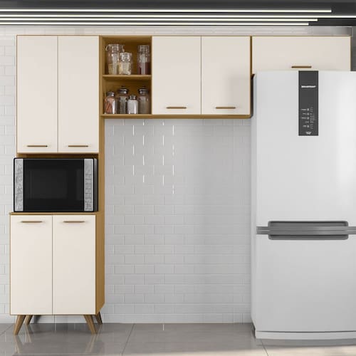 A Cozinha Compacta 7 portas paneleiro duplo Olinda Poliman ? um produto para quem deseja praticidade e funcionalidade. O paneleiro possui 4 portas de bater, prateleiras internas e nicho para micro-ondas -A.40xL.55xP.43cm-, a?reo 120cm com amplo espa?o interno com prateleira, 2 portas e nicho decorativo -A.26xL.34xP.24cm- dando um charme a pe?a. O a?reo geladeira possui porta basculante com pist?o a g?s permitindo uma abertura mais suave que mant?m a porta suspensa podendo ser utilizado sobre a geladeira ou fog?o, dobradi?as refor?adas de 26mm, puxadores em pol?mero ouro fosco, p?s modelo palito em PVC regul?veis ao piso de 18cm que permitem o nivelamento perfeito. Estrutura em MDP e portas com pintura UV acetinada. Produto ecologicamente correto com embalagem preparada para evitar avarias e permitir que o produto chegue em perfeito estado em sua casa. Perfeita combina??o com os mais variados ambientes. Qualidade que s? a Poliman oferece em seus produtos.