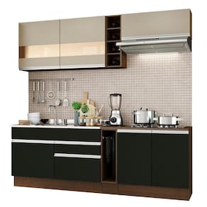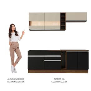 - Itens inclusos: 1 Balcão de pia com duas gavetas e uma porta, não acompanha tampo deste balcão | 1 Porta-panos com tampo em MDP | 1 Balcão com duas portas e tampo em MDP | 1 Armário aéreo com duas portas com detalhe em vidro reflex | 1 Armário aéreo com uma porta basculante | 1 Adega