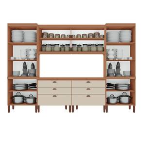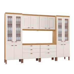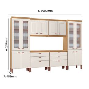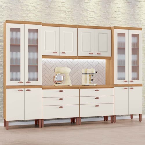 O conjunto é composto por armários aéreos e balcões, proporcionando organização eficiente para utensílios, mantimentos e eletros, além de valorizar o ambiente da sua cozinha.