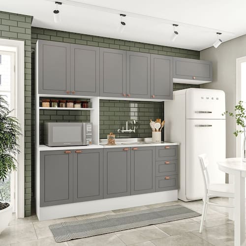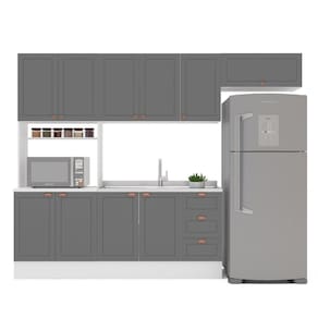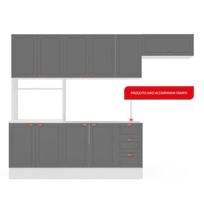 A cozinha é composta de Paneleiro / Torre quente, aéreo 3 portas, balcão 2 portas 3 gavetas e basculante. Acabamento da Prateleira: Pintura Escala de Brilho da Prateleira: Fosco Acabamento da Gaveta: Pintura Escala de Brilho da Gaveta: Fosco Material do Puxador da Gaveta: Plástico Acabamento da Porta: Pintura Escala de Brilho da Porta: Fosco Material do Puxador da Porta: Plástico Acabamento dos Pés: Poliéster Acompanha Rodapé Decorativo: Sim Acompanha Tampo: Não Altura dos Pés: 17 cm Altura Máxima dos Pés: 17.0000 Ambiente Principal: Cozinha Balcão Suporta Pia: Sim codigo_ean: 7900288008886 Complexidade da Montagem: Média: pode ser montado por mais de uma pessoa e/ou necessite de maior conhecimento para montagem Cor: Branco/Cinza Cor do Produto: Branco/Cinza Cor Flex: não Cor Interna: Branco Escala de Brilho: Fosco Espessura do Material da Estrutura: 15 mm Gaveta com Chave: Não Itens Inclusos: 1 móvel desmontado + 1 kit de ferragens + 1 termo de garantia e + 1 manual de montagem. Linha ou Coleção: Pérola Manual de Montagem e Instalação: https://product-hub-prd.madeiramadeira.com.br/968308/documents/7ef5c739-bcf8-4d91-9547-f2ee15d90b7a252342249331730311211943.pdf Marca: Yescasa Material da Dobradiça/Corrediça da Porta: Metálica Material da Gaveta: MDF Material da Porta: MDF Material da Prateleira: MDP Material dos Pés: Plástico Medida de cada item (A x L x P): Paneleiro/Torre Quente: 219,4 x 80 x 52 Balcão: 84 x 120 x 50,5 Aéreo: 67 x 120 x 36,5 Basculante: 33,5 x 80 x 36,5 modular: Sim Montagem Flex: sim Necessita Montagem: Sim O Balcão Acompanha Pia: Não Origem do Produto: Nacional Pés Reguláveis: Sim Peso: 126,85 kg Peso Máximo por Gaveta: 5 kg Peso Máximo por Prateleira: 10 kg Possui Pés: 09 Possui Portas: Sim Possui Prateleiras: Sim Possui recorte para Cooktop: Não Possui Rodízio: Não Possui Vidro: Não Produto Montado: Sim Recomendações de Uso, Manutenção e Limpeza: Utilize um pano macio umedecido com água e sabão neutro, seguido de pano seco. Não utilize produtos químicos ou abrasivos para limpeza, pois estes danificam o revestimento do móvel. Sapatas Niveladoras: Sim Sistema de Montagem: Cavilha, parafuso, minifix e prego Suporta Até (kg): 10 kg Tamanho Indicado da Pia: L: 120 x P: 52 cm Tamanho Indicado do Tampo: L: 120 x P: 52 cm Tipo de Corrediça da Gaveta: Metálica Telescópica Tipo de Dobradiça da Porta: Soft close Tipo de Puxador da Gaveta: Externo Tipo de Puxador da Porta: Externo