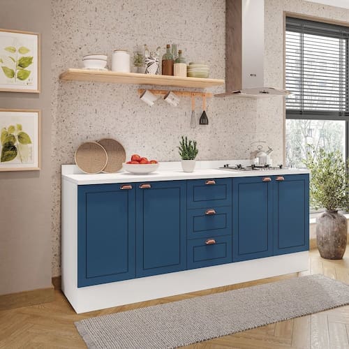 A Cozinha Pérola Compacta possui 2 peças com altura de 93,7 cm largura de 200 cm e profundidade de balcão de 52 cm. Com portas e gavetas em MDF usinadas em baixo relevo, possui estilo Americano e design contemporâneo, funcional e prático para seu dia a dia. Seus puxadores são no formato de concha. Possui dobradiças 3,5cm Slide On (sistema de amortecimento anti batida) e na porta basculante possui além das dobradiças Slide On pistão para proporcionar uma maior abertura. Acompanha rodapé e Tampo no balcão de 120 cm. Acabamento da Prateleira: Pintura UV Escala de Brilho da Prateleira: Fosco Acabamento da Gaveta: Pintura UV Escala de Brilho da Gaveta: Fosco Material do Puxador da Gaveta: Plástico Acabamento da Porta: Pintura UV Escala de Brilho da Porta: Fosco Material do Puxador da Porta: Plástico Acabamento dos Pés: Poliéster Acompanha Rodapé Decorativo: Sim Acompanha Tampo: Sim Altura dos Pés: 17 cm Altura Máxima dos Pés: 17.0000 Ambiente Principal: Cozinha Balcão Suporta Pia: Sim codigo_ean: 7900288013125 Complexidade da Montagem: Média: pode ser montado por mais de uma pessoa e/ou necessite de maior conhecimento para montagem Cor: Branco/Azul Cor do Produto: Branco/Azul Cor Flex: não Cor Interna: Branco Escala de Brilho: Fosco Espessura do Material da Estrutura: 15 mm Espessura do Tampo: 27 mm Gaveta com Chave: Não Itens Inclusos: 1 móvel desmontado + kit de ferragens + termo de garantia + manual de montagem. Linha ou Coleção: Pérola Manual de Montagem e Instalação: https://product-hub-prd.madeiramadeira.com.br/966572/documents/102d92cd-b3bf-4926-8d24-2cdb726c1f7f2513950493317302303287423.pdf Marca: Yescasa Material da Dobradiça/Corrediça da Porta: Metálica Material da Gaveta: MDF Material da Porta: MDF Material da Prateleira: MDP Material do Tampo: MDP Material dos Pés: Plástico Medida de cada item (A x L x P): Balcão 2 portas 3 gavetas: 84 x 120 x 50,5 Balcão 2 portas: 93,7 x 80,2 x 52,5 modular: Sim Montagem Flex: sim Necessita Montagem: Sim O Balcão Acompanha Pia: Não Origem do Produto: Nacional Pés Reguláveis: Sim Peso: 75,24 kg Peso Máximo por Gaveta: 5 kg Peso Máximo por Prateleira: 10 kg Possui Pés: 09 Possui Portas: Sim Possui Prateleiras: Sim Possui recorte para Cooktop: Não Possui Rodízio: Não Possui Vidro: Não Produto Montado: Sim Recomendações de Uso, Manutenção e Limpeza: Utilize um pano macio umedecido com água e sabão neutro, seguido de pano seco. Não utilize produtos químicos ou abrasivos para limpeza, pois estes danificam o revestimento do móvel. Sapatas Niveladoras: Sim Sistema de Montagem: Cavilha, parafuso, minifix e prego Suporta Até (kg): 10 kg Tamanho Indicado da Pia: L: 120 x P: 52 cm Tamanho Indicado do Tampo ou Pia: L: 120 x P: 52 cm Tipo de Corrediça da Gaveta: Metálica Telescópica Tipo de Dobradiça da Porta: Soft close Tipo de Puxador da Gaveta: Externo Tipo de Puxador da Porta: Externo
