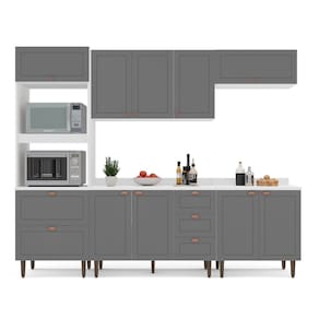 A Cozinha Pérola Completa possui 5 peças com altura de 219,4 cm largura de 270,2 cm e profundidade de balcão de 52 cm. Com portas e gavetas em MDF usinadas em baixo relevo, possui estilo Americano e design contemporâneo, funcional e prático para seu dia a dia. Seus puxadores dos módulos inferior são no formato de concha. E na parte superior são modelo pontual, ambos na cor cobre. Possui dobradiças 35mm Slide On (sistema de amortecimento anti batida) e na porta basculante possui além das dobradiças Slide On pistão para proporcionar uma maior abertura. Acompanha Tampo no balcão de 120 cm. A cozinha é composta de Torre quente, aéreo 3 portas, balcão 2 portas 3 gavetas, basculante e balcão 2 portas.