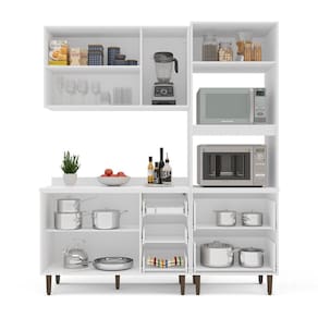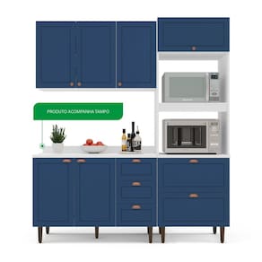 A Cozinha Pérola Completa possui 3 peças com altura de 219,4 cm largura de 200 cm e profundidade de balcão de 52 cm. Com portas e gavetas em MDF usinadas em baixo relevo, possui estilo Americano e design contemporâneo, funcional e prático para seu dia a dia. Seus puxadores dos módulos inferior são no formato de concha. E na parte superior são modelo pontual, ambos na cor cobre. Possui dobradiças 3,5cm Slide On (sistema de amortecimento anti batida) e na porta basculante possui além das dobradiças Slide On pistão para proporcionar uma maior abertura. Acompanha tampo no balcão. Acabamento da Prateleira: Pintura UV Escala de Brilho da Prateleira: Fosco Acabamento da Gaveta: Pintura UV Escala de Brilho da Gaveta: Fosco Material do Puxador da Gaveta: Plástico Acabamento da Porta: Pintura UV Escala de Brilho da Porta: Fosco Material do Puxador da Porta: Plástico Acabamento dos Pés: Polipropileno Acompanha Rodapé Decorativo: Não Acompanha Tampo: Sim Altura dos Pés: 17 cm Altura Máxima dos Pés: 17.0000 Ambiente Principal: Cozinha Balcão Suporta Pia: Sim codigo_ean: 7909903989098 Complexidade da Montagem: Média: pode ser montado por mais de uma pessoa e/ou necessite de maior conhecimento para montagem Cor: Branco/Azul Cor do Produto: Branco/Azul Cor Flex: não Cor Interna: Branco Escala de Brilho: Fosco Espessura do Material da Estrutura: 15 mm Espessura do Tampo: 27 mm Gaveta com Chave: Não Itens Inclusos: 1 móvel desmontado + kit de ferragens + termo de garantia + manual de montagem. Linha ou Coleção: Pérola Manual de Montagem e Instalação: https://product-hub-prd.madeiramadeira.com.br/962881/documents/c4eb6a71-e802-4f7e-921a-5d62802749332493296493317297996011167.pdf Marca: Yescasa Material da Dobradiça/Corrediça da Porta: Metálica Material da Gaveta: MDF Material da Porta: MDF Material da Prateleira: MDP Material do Tampo: MDP Material dos Pés: Plástico Medida de cada item (A x L x P): Torre de Forno: 219,4 x 70 x 52 / Aéreo: 67 x 120 x 36,5 / Balcão 93,5 x 120 x 52 modular: Sim Montagem Flex: sim Necessita Montagem: Sim O Balcão Acompanha Pia: Não Origem do Produto: Nacional Pés Reguláveis: Sim Peso: 123,33 kg Peso Máximo por Gaveta: 5 kg Peso Máximo por Prateleira: 10 kg Possui Pés: 09 Possui Portas: Sim Possui Prateleiras: Sim Possui recorte para Cooktop: Não Possui Rodízio: Não Possui Vidro: Não Produto Montado: Sim Recomendações de Uso, Manutenção e Limpeza: Utilize um pano macio umedecido com água e sabão neutro, seguido de pano seco. Não utilize produtos químicos ou abrasivos para limpeza, pois estes danificam o revestimento do móvel. Sapatas Niveladoras: Sim Sistema de Montagem: Cavilha, parafuso, minifix e prego Suporta Até (kg): 10 kg Tamanho Indicado da Pia: L: 120 x P: 52 cm Tamanho Indicado do Tampo ou Pia: L: 120 x P: 52 cm Tipo de Corrediça da Gaveta: Metálica Telescópica Tipo de Dobradiça da Porta: Soft close Tipo de Puxador da Gaveta: Externo Tipo de Puxador da Porta: Externo