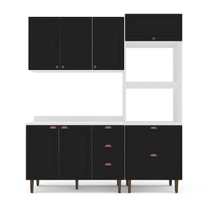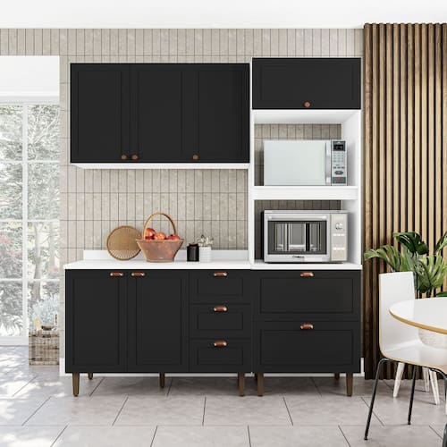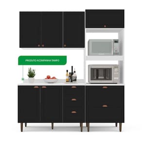 A Cozinha Pérola Completa possui 3 peças com altura de 219,4 cm largura de 200 cm e profundidade de balcão de 52 cm. Com portas e gavetas em MDF usinadas em baixo relevo, possui estilo Americano e design contemporâneo, funcional e prático para seu dia a dia. Seus puxadores dos módulos inferior são no formato de concha. E na parte superior são modelo pontual, ambos na cor cobre. Possui dobradiças 3,5cm Slide On (sistema de amortecimento anti batida) e na porta basculante possui além das dobradiças Slide On pistão para proporcionar uma maior abertura. Acompanha tampo no balcão. Acabamento da Prateleira: Pintura UV Escala de Brilho da Prateleira: Fosco Acabamento da Gaveta: Pintura UV Escala de Brilho da Gaveta: Fosco Material do Puxador da Gaveta: Plástico Acabamento da Porta: Pintura UV Escala de Brilho da Porta: Fosco Material do Puxador da Porta: Plástico Acabamento dos Pés: Polipropileno Acompanha Rodapé Decorativo: Não Acompanha Tampo: Sim Altura dos Pés: 17 cm Altura Máxima dos Pés: 17.0000 Ambiente Principal: Cozinha Balcão Suporta Pia: Sim codigo_ean: 7909903989111 Complexidade da Montagem: Média: pode ser montado por mais de uma pessoa e/ou necessite de maior conhecimento para montagem Cor: Branco/Preto Cor do Produto: Branco/Preto Cor Flex: não Cor Interna: Branco Escala de Brilho: Fosco Espessura do Material da Estrutura: 15 mm Espessura do Tampo: 27 mm Gaveta com Chave: Não Itens Inclusos: 1 móvel desmontado + kit de ferragens + termo de garantia + manual de montagem. Linha ou Coleção: Pérola Manual de Montagem e Instalação: https://product-hub-prd.madeiramadeira.com.br/962888/documents/6dcf1812-46d5-40ba-8339-5db8b56498322493296493317297996011167.pdf Marca: Yescasa Material da Dobradiça/Corrediça da Porta: Metálica Material da Gaveta: MDF Material da Porta: MDF Material da Prateleira: MDP Material do Tampo: MDP Material dos Pés: Plástico Medida de cada item (A x L x P): Torre de Forno: 219,4 x 70 x 52 / Aéreo: 67 x 120 x 36,5 / Balcão 93,5 x 120 x 52 modular: Sim Montagem Flex: sim Necessita Montagem: Sim O Balcão Acompanha Pia: Não Origem do Produto: Nacional Pés Reguláveis: Sim Peso: 123,33 kg Peso Máximo por Gaveta: 5 kg Peso Máximo por Prateleira: 10 kg Possui Pés: 09 Possui Portas: Sim Possui Prateleiras: Sim Possui recorte para Cooktop: Não Possui Rodízio: Não Possui Vidro: Não Produto Montado: Sim Recomendações de Uso, Manutenção e Limpeza: Utilize um pano macio umedecido com água e sabão neutro, seguido de pano seco. Não utilize produtos químicos ou abrasivos para limpeza, pois estes danificam o revestimento do móvel. Sapatas Niveladoras: Sim Sistema de Montagem: Cavilha, parafuso, minifix e prego Suporta Até (kg): 10 kg Tamanho Indicado da Pia: L: 120 x P: 52 cm Tamanho Indicado do Tampo ou Pia: L: 120 x P: 52 cm Tipo de Corrediça da Gaveta: Metálica Telescópica Tipo de Dobradiça da Porta: Soft close Tipo de Puxador da Gaveta: Externo Tipo de Puxador da Porta: Externo