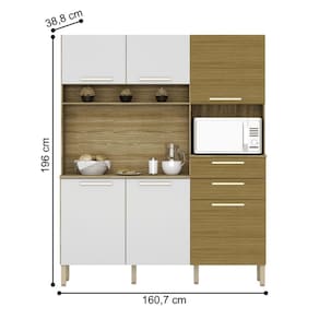 A Cozinha é produzida com madeira reconstituída - MDP de 12 mm e MDP de 15 mm nos tampos, provindo de reservas florestais para este fim, respeitando o meio ambiente. Possui seis portas, duas amplas gavetas - nas portas e gavetas são utilizados dobradiças e corrediças 100% metálicas. Os puxadores são em plástico resistente (poliestireno) com acabamento metalizado, que proporciona grande durabilidade. Seis pés reguláveis em plástico resistente (polipropileno) garantem a estabilidade do produto, podendo-se fazer pequenes ajustes na montagem, para o produto se adequar mesmo em pisos com pequenas irregularidades. Conta com nicho para pequenos objetos, além disso, tem nicho para micro-ondas e passa-fio no traseiro facilitando o acesso à tomada na parede. O espaço interno é bem dividido com a utilização de prateleiras, para melhor organizar os utensílios da cozinha. O acabamento é com pintura UV, deixando o móvel mais bonito com padrões de cor que trazem modernidade e beleza a sua cozinha.