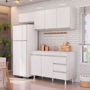 Cada peça é construída em 100% MDF e possui um acabamento em BP que garante durabilidade e resistência. Este conjunto inclui um impressionante Balcão Gabinete de 120cm, completo com 03 gavetas equipadas com corrediças telescópicas para um deslize suave e silencioso. Além disso, o armário da geladeira possui pistão a gás, proporcionando abertura e fechamento suaves e sem esforço.
