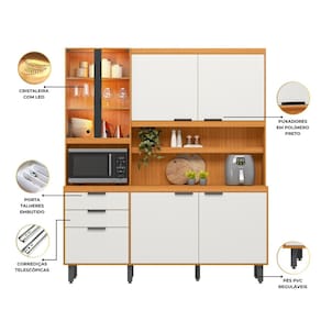O grande diferencial da Cozinha Murano são suas duas portas com vidro transparente e iluminação LED embutida, que criam um ponto de destaque luxuoso no ambiente. Além da estética premium, o kit oferece praticidade real com um nicho exclusivo para micro-ondas e gavetas com corrediças telescópicas, que garantem abertura total e suave. É o móvel ideal para manter utensílios, eletrodomésticos e mantimentos sempre em ordem com durabilidade superior.
