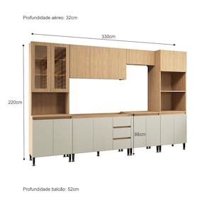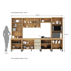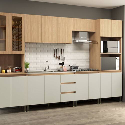 MB 9013 Cozinha Rebeca com 16 portas, 3 gavetas, estrutura em MDP 18mm, dobradiças com amortecimento e corrediças telescópicas para maior praticidade e durabilidade, ideal para organizar sua cozinha com estilo e praticidade. Acabamento da Prateleira: Pintura Escala de Brilho da Prateleira: Fosco Acabamento da Gaveta: Pintura Escala de Brilho da Gaveta: Fosco Acabamento da Porta: Pintura Escala de Brilho da Porta: Fosco Acompanha Tampo: Não Altura dos Pés: 17 cm Ambiente Principal: Cozinha Complexidade da Montagem: Alta: deve ser montado por um montador especializado Cor: Mel/Off White Cor do Produto: Mel/Off White Cor Interna: Mel Escala de Brilho: Fosco Espessura do Material da Estrutura: 18 mm Gaveta com Chave: Não Itens Inclusos: 1 Paneleiro, 1 Aereo 120 Cm, 1 Aereo 70 Cm, 1 Torre, 1 Balcão 0 Cm, 1 Balcão 120 Cm Linha ou Coleção: Cozinha Rebeca Manual de Montagem e Instalação: https://product-hub-prd.madeiramadeira.com.br/939463/documents/23c49ee8-748f-4904-b0c5-df4358c3de332314515395217262283350172.pdf Material da Dobradiça/Corrediça da Porta: Metálica Material da Gaveta: MDP Material da Porta: MDP Material da Prateleira: MDP Material dos Pés: ABS Medida de cada item (A x L x P): Paneleiro 70x220x52, Balcão 120x88x52, Balcao 70x88x52, Torre 70x220x52, Aereo 70x32x32, Aereo 120x64x32 modular: Sim Necessita Montagem: Sim O Balcão Acompanha Pia: Não Origem do Produto: Nacional Pés Reguláveis: Sim Peso: 221 kg Peso Máximo por Gaveta: 3 kg Peso Máximo por Prateleira: 7 kg Possui Pés: 17 Possui Portas: Sim Possui Prateleiras: Sim Possui recorte para Cooktop: Não Possui Rodízio: Não Recomendações de Uso, Manutenção e Limpeza: Antes de limpar recomenda-se que seja retirada toda a poeira com um espanador ou flanela seca para evitar riscos na superfície, após utilize um pano umido em água, macio e limpo. Sapatas Niveladoras: Não Sistema de Montagem: Parafusos Suporta Até (kg): 200 kg Tamanho Indicado da Pia: 120 CM Tamanho Indicado do Tampo: 120 CM Tipo de Corrediça da Gaveta: Telescópica Tipo de Dobradiça da Porta: 35 mm Tipo de Puxador da Gaveta: Embutido Tipo de Puxador da Porta: Embutido