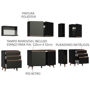 Um diferencial a mais é que todos os balcões acompanham tampos em MDP. O tampo do balcão maior pode ser removido para instalação de pia de inox ou pedra com espaço de 120 x 52 cm.