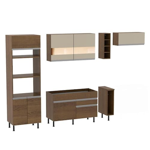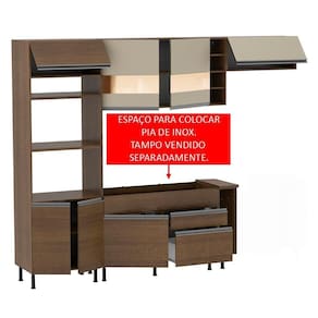 - Itens inclusos: Uma (1) torre quente com dois (2) nichos para forno e micro-ondas, um (1) nicho menor e três (3) portas sendo uma (1) basculante | Um (1) balcão de pia com duas (2) gavetas e uma (1) porta (não acompanha tampo) | Um (1) balcão porta panos com tampo Rustic | Um (1) armário aéreo com duas (2) portas com detalhe em vidro reflex | Uma (1) mini adega | Um (1) aéreo com uma (1) porta basculante