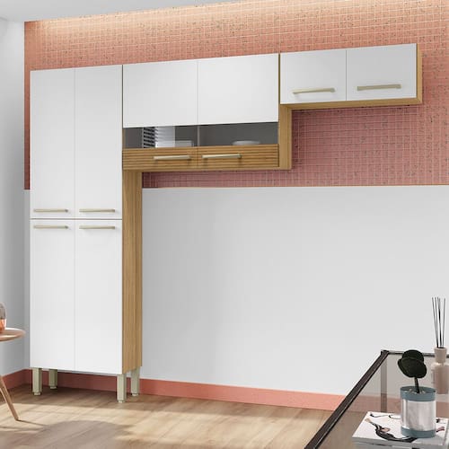 Cozinha (Sem Balcão) 6 Portas 2 Portas de Vidro Nala Freijo/Off White/CP-Ripado Freijo - SSX Multicoisas - Off White