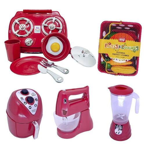 O kit vem com fogão cooktop com kit de jantarzinho, mercadinho com frutinhas e legumes, liquidificador e panelinha de pressão, batedeira